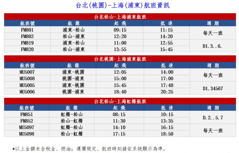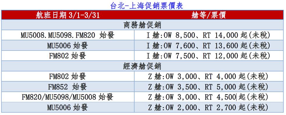 中國東方航空 台北-上海 促銷 Z艙來回最低$2,700起(未稅) 飛往上海,一口好價說走就走! 開票日:即日起-2026/03/31