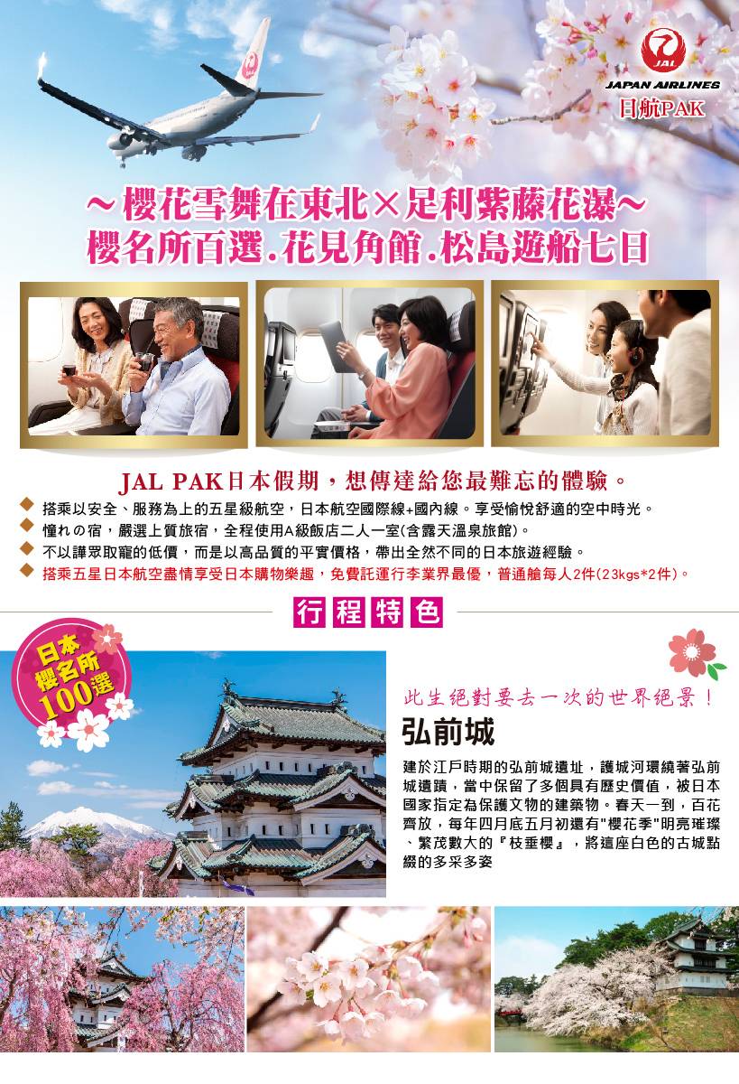 1.造訪東北地區七處「日本櫻名所100選」:弘前城公園、檜木內川堤、角館、北上市展勝地公園、白石川堤、二本松市霞ヶ城公園、三春瀧櫻。